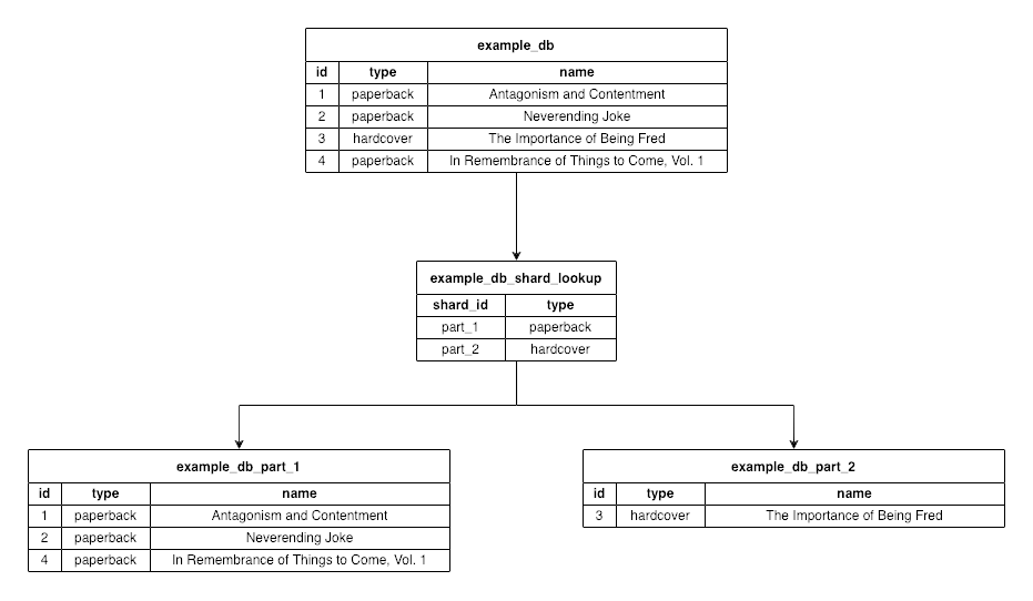 Here, the initial database (example_db) gets partitioned into two databases (example_db_part_1 and example_db_part_2). Each partition, or “shard”, gets some rows from the initial database.